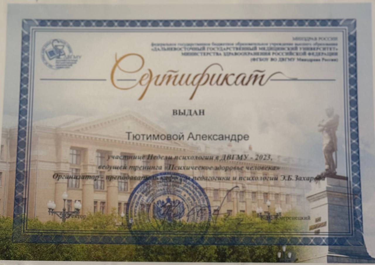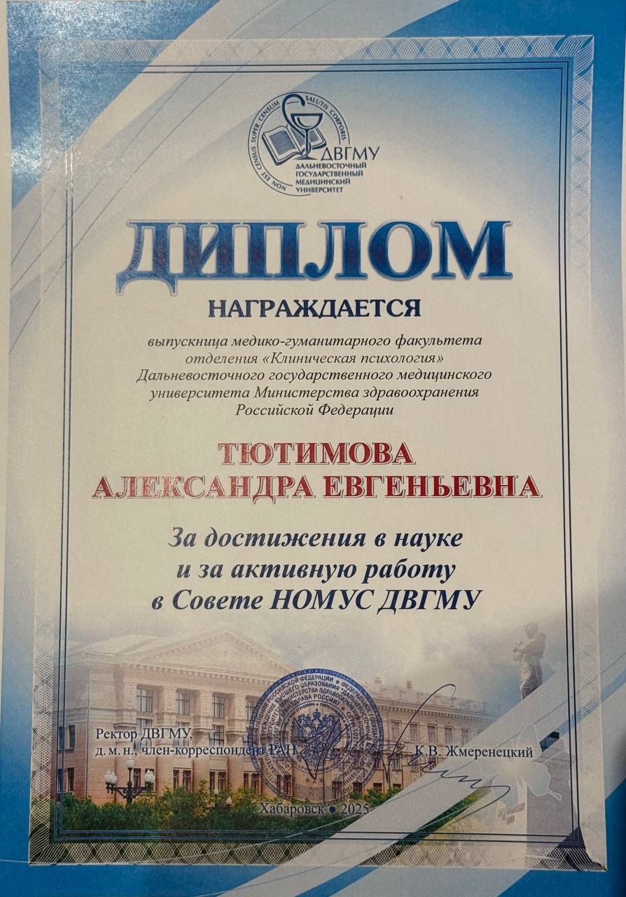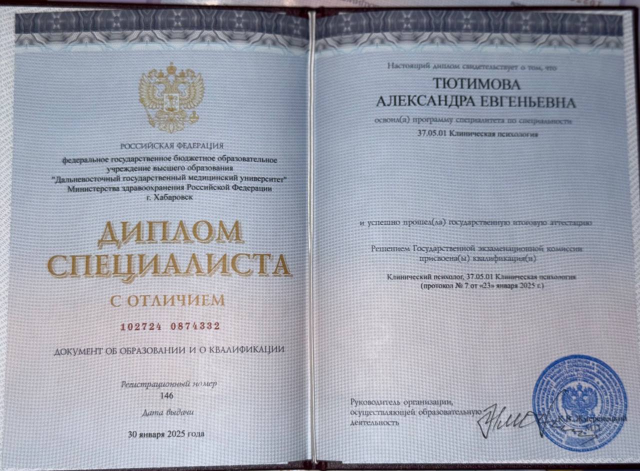 Диплом с отличием Дальневосточного государственного медицинского университета по специальности 37.05.01 Клиническая психология получен 30 января 2025 г.