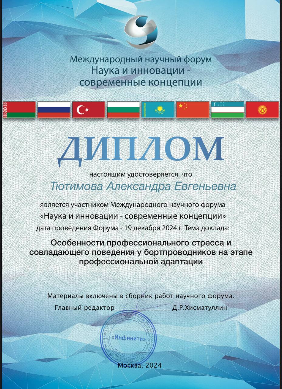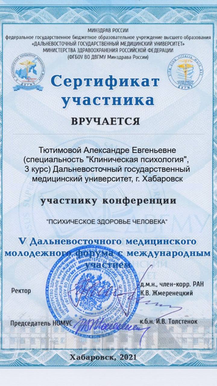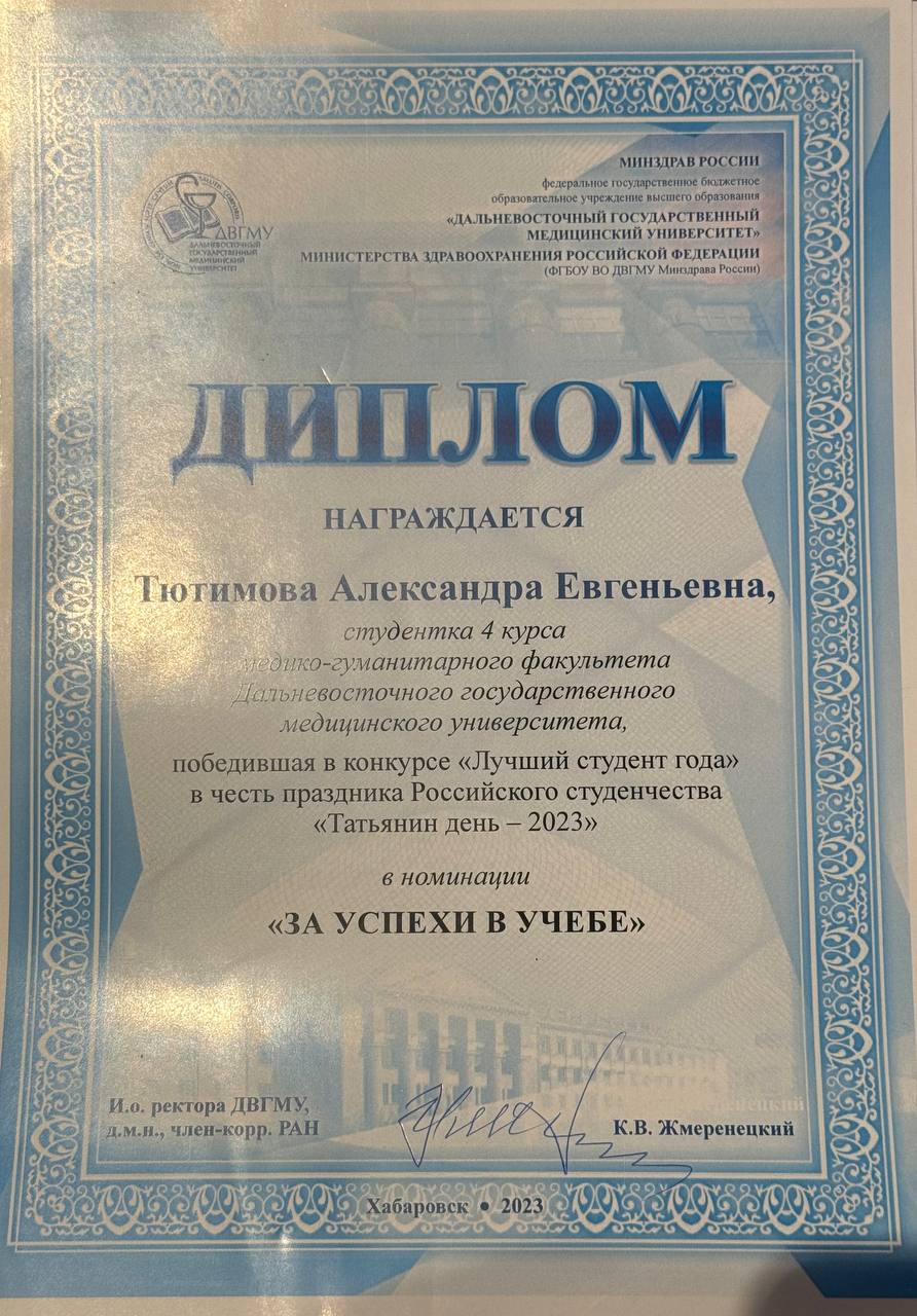 Диплом с отличием Дальневосточного государственного медицинского университета по специальности 37.05.01 Клиническая психология получен 30 января 2025 г.